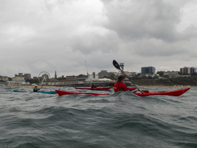 After about 2km it became clear that the wind was having too much of an effect on the group and we decided to land near to Bournemouth Pier – landing through surf. Breaking out the group shelter to keep the wind from getting us too cold, we decided that the best plan would be to return back to the start point.